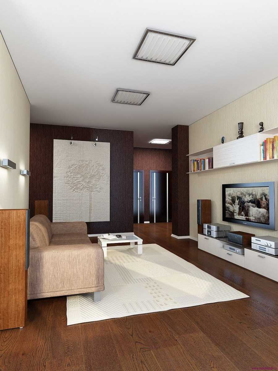 Для зала часто применяется прием контраста, когда цвет мебели отличается от отделки стен, привлекая все внимание на себя. Если гостиная очень напоминает по форме пеналы, то можно воспользоваться хорошо знакомым приемом – зонированием