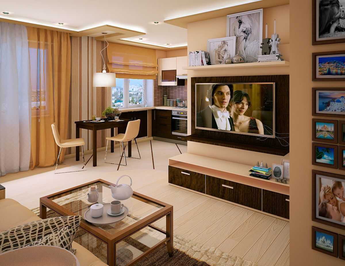 Проходная гостиная с мини-кухней часто встречается в предложениях для квартир-студий. Это решение, которое идеально подойдет для небольших участков, если вам небезразлично оптическое увеличение пространства. Очень часто бывают ситуации, когда владельцы однокомнатных квартир решают открыть маленькую кухню для гостиной. В результате границы между комнатами выравниваются, что создает впечатление простора.