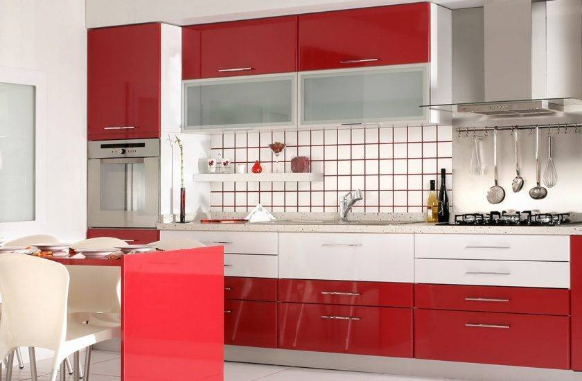 - Богатое разнообразие расцветок. Можно выбрать гарнитуры не только основных цветов, но и их оттенков. Большой популярностью пользуются фасады красного, белого, черного, фисташкового, ванильного, коричневого, серого, бежевого цвета. Часто кухонные гарнитуры окрашивают однотонно либо сочетают 2-3 цвета, гармонирующих между собой.