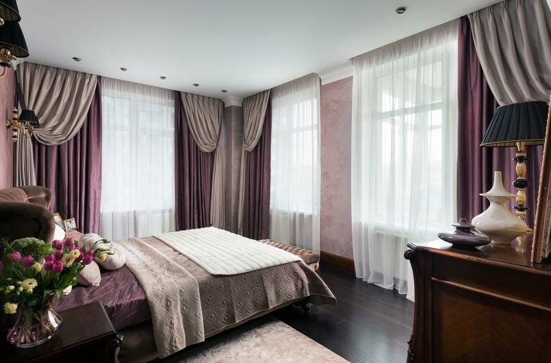 Чтобы подчеркнуть изящество угловых окон, шторы выбирают длинные, до пола, из мягких, струящихся тканей. Чем богаче будет декор окна, тем эффектнее будет смотреться выделенный угол.