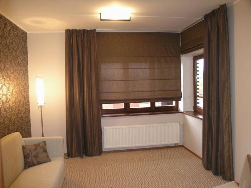 Римскими шторами можно украсить гостиную или спальню, если в качестве дополнения привлечь прямые шторы соответствующего цвета.
