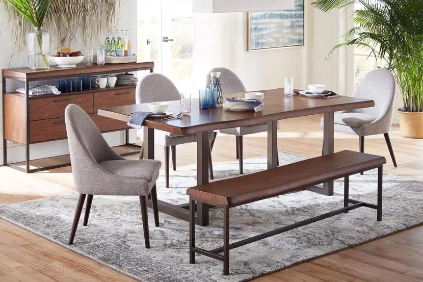 Важное свойство стульев – комфорт, поэтому на выбор может повлиять наличие подлокотников и обивки. Комплект со скамейкой