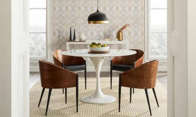 Классический стиль. Подойдёт мебель чётких геометрических форм и нейтральных оттенков. Любители эклектики могут попробовать сочетание разных направлений. Например, классический стол дополнят стулья в стиле ар-деко контрастной расцветки. Иногда достаточно выразительной детали: один из стульев с мягкой спинкой можно заменить креслом с обивкой капитоне.