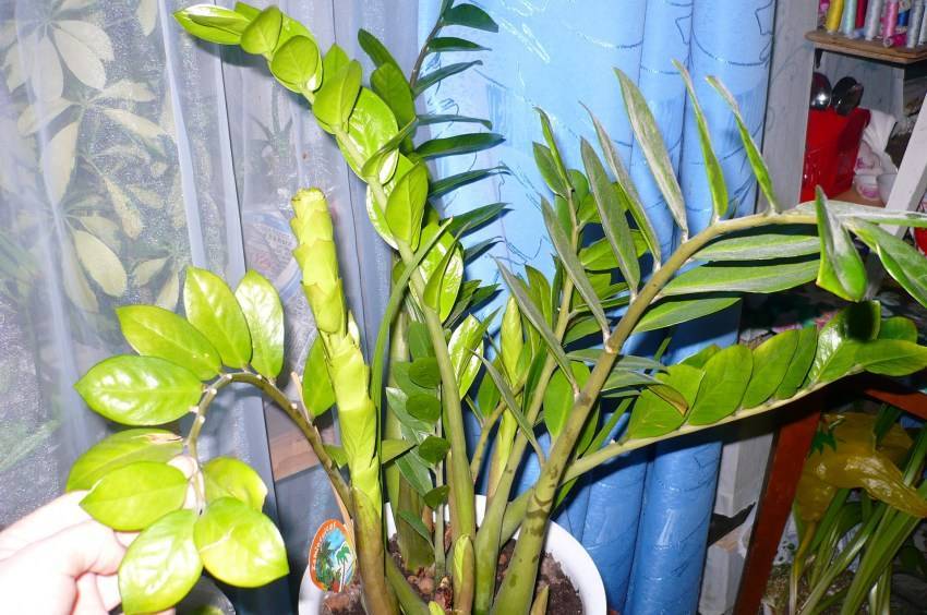 Взрослый экземпляр замиокулькуса имеет 15-17 листьев и если желтеют старые листья, то это, скорее всего, естественный процесс замены листьев, но если начали желтеть молодые листочки, то это, похоже, результат чрезмерного увлажнения субстрата и как следствие, загнивание корней.