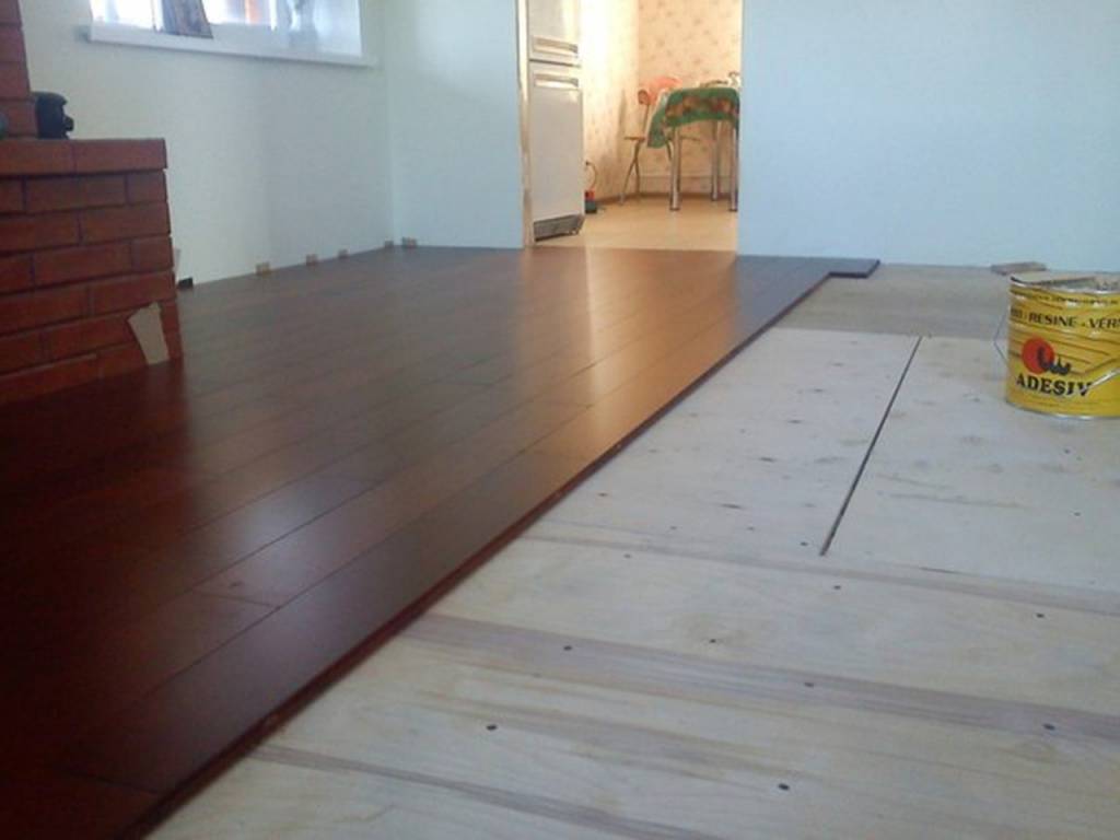 Пожалуй наиболее важный плюс перед массивом в том, что для укладки не обязательно настилать фанеру. Технологическая конструкция позволяет ее стелить прямо на бетонное основание. Но оно должно быть качественно подготовленным, то есть выровненным и с гидроизоляцией. Отсутствие фанеры экономит достаточно много денег, что является заметным преимуществом. В то же время, такое покрытие гораздо проще состыковать с плиткой или другими видами полов.