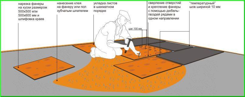 В качестве основания может быть выбрана фанера, плиты ОСП (18 мм) либо дощатый настил (20 мм). Края плит должны стыковаться на лагах, но не между ними. Зазор между листами должен получиться не менее двух миллиметров, меж листами и стеной — от десяти (но не более пятнадцати). Фанера и ОСП крепятся посредством шурупов.