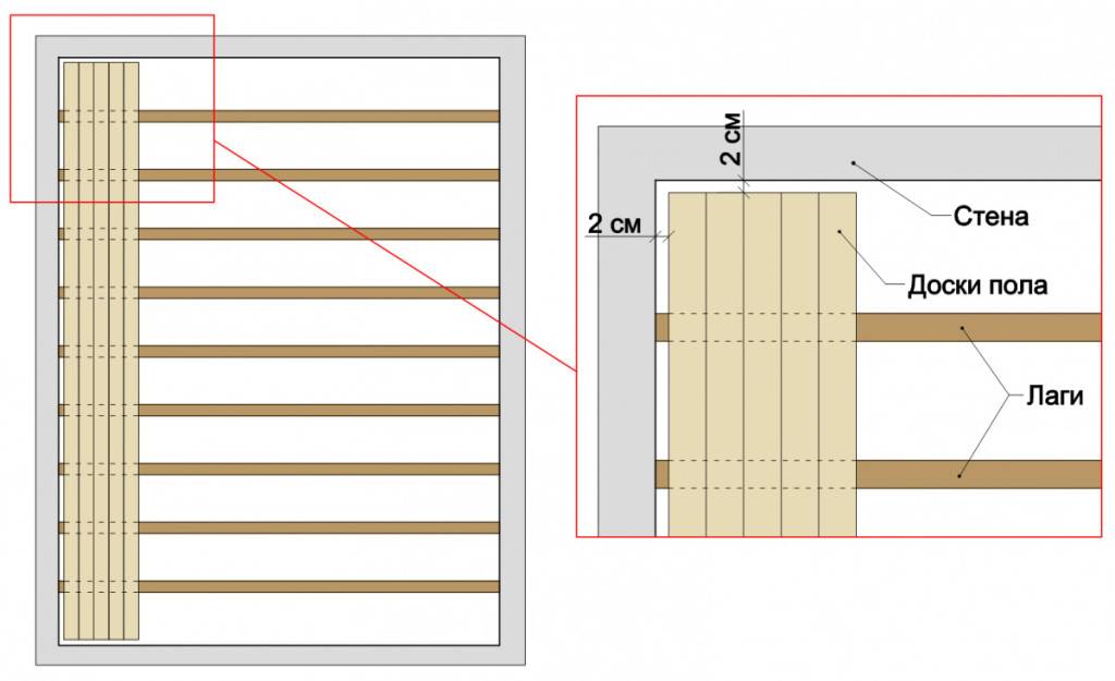 При состыковке планок крайне важно учесть такую вещь, как зазоры: в частности, между досками и стенами. Слишком большое расстояние меж половицами всегда можно устранить при помощи клиньев. Первый ряд следует укладывать пазом к стене