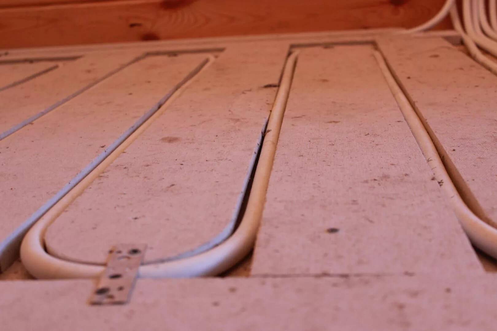 Напольный обогрев с деревянным контуром используют под линолеум, под ламинат. Под плитку необходимо залить водяную магистраль бетонным раствором. Как выполняют заготовку для монтажа жидкостного контура?