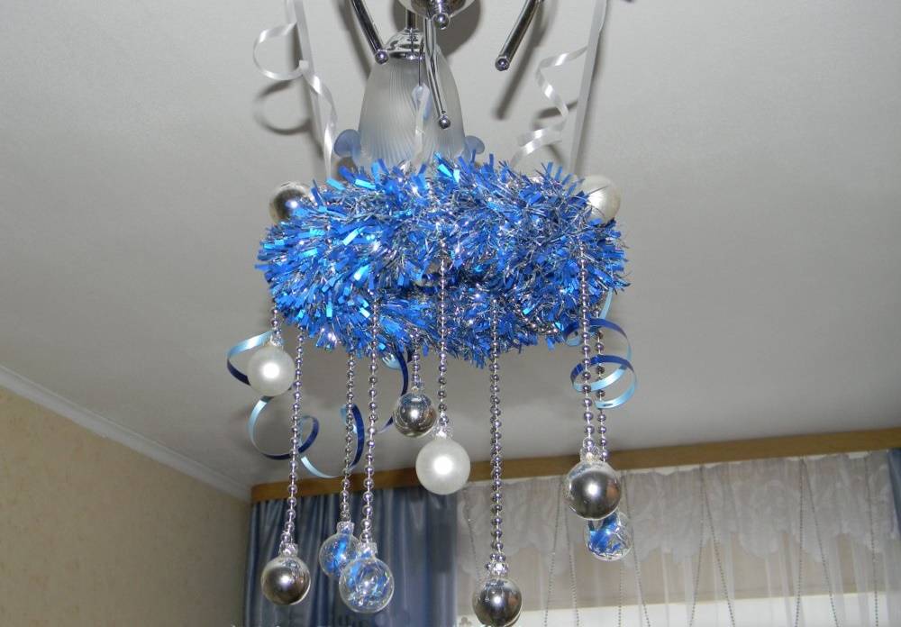 Это самый простой вариант украсить любую люстру на Новый год своими руками. Блестящие украшения подходят современному интерьеру. Светильник обвивают плотно или добавляют немного декора. Дождик и мишура красиво смотрятся, когда свисают вниз. Но нужно следить, чтобы осталось достаточно места для того, чтобы проходить, не задевая свисающие концы головой.