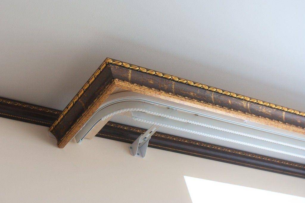 На потолок из гипсокартона закрепить потолочный карниз можно, но несущая способность ГКЛ ограничена. В связи с этим, шторы и сама планка должны быть легкими. Чтобы не учитывать эти ограничения, нужно усилить потолок, путем установки бруска из дерева на том участке, где будет зафиксирован держатель.