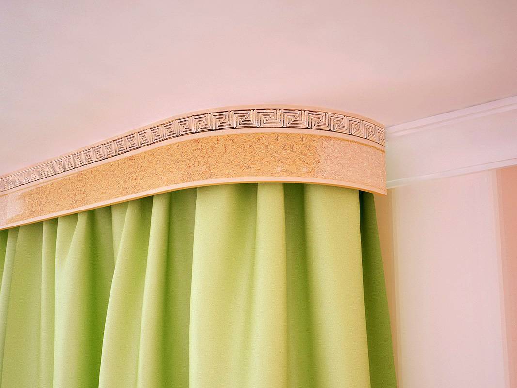 - если потолок из железобетона, то никаких конструктивных ограничений нет. Карниз может быть изготовлен из различных пород дерева (даже тяжелых), стали, пластика и т. д., а сами гардины могут быть очень массивными;
