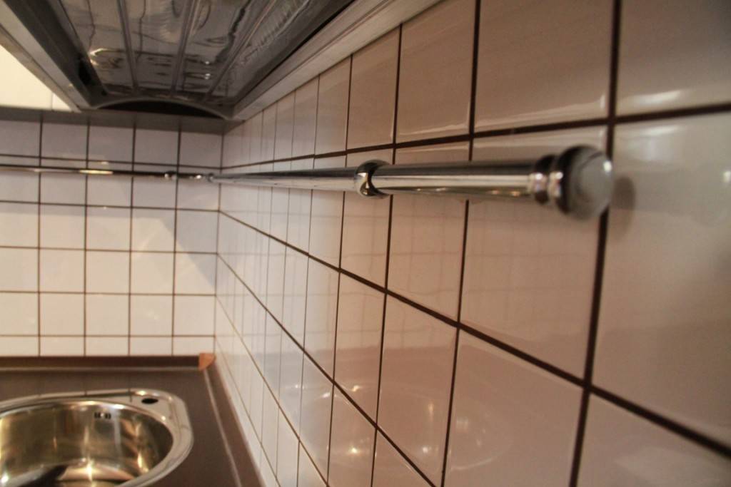 Прежде, чем крепить рейлинг на кухонный фартук, делают разметку. Дюбели располагают строго горизонтально, кронштейны крепят по строительному уровню без перекосов. Даже небольшой наклон грозит перекатыванием крючков в сторону. Желательно вешать штангу на ровную стену, так как искривления поверхности будут видны на фоне перекладины.