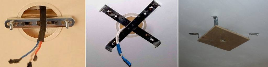 ПВХ пленка (или тканевое полотно) не может служить основанием для светильников. Монтажные кронштейны для них можно изготовить своими руками. Для этого потребуется листовой материал, который легко обрабатывается и не боится нагрева от лампочки.
