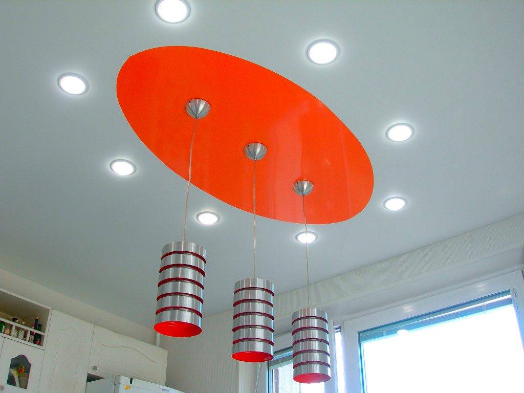 Если же установка светильников в натяжные потолки происходит на кухне – следует учитывать все зоны освещенности, которые располагаются над рабочими поверхностями и обеденной зоной. Наиболее подходящими для кухни есть рядная или периферийная подсветка. Рядный вариант подсветки основан на расположении светильников двумя рядами с расстоянием каждого от центра кухни на 60 см. Если же данный вариант установки светильников используется в жилых комнатах, то, как правило, устанавливают 2, 3, а то и 4 ряда, в зависимости от их ширины.