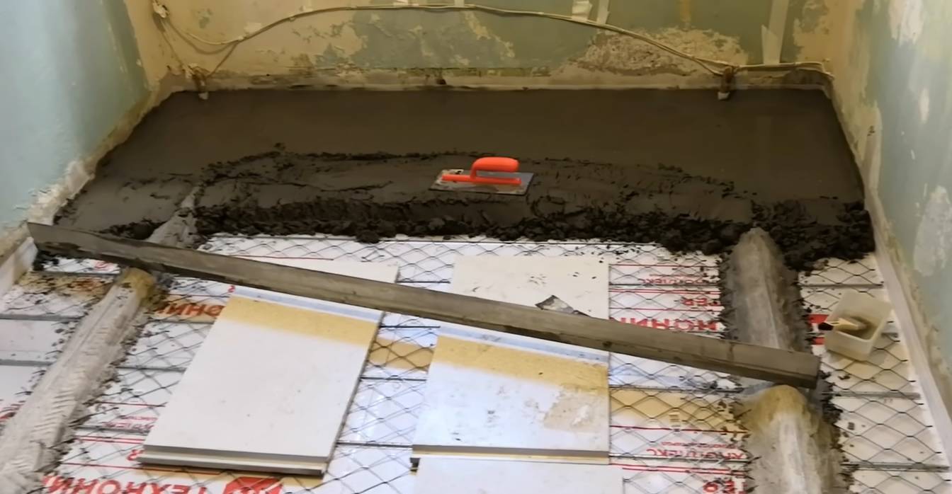 По краям строение огораживают листами рубероида или полиэтилена, сверху пеноплекс также покрывают этими материалами, затем на них монтируется слой цемента, и металлической сетки для его укрепления, при этом толщина стяжки должна быть пять сантиметров.