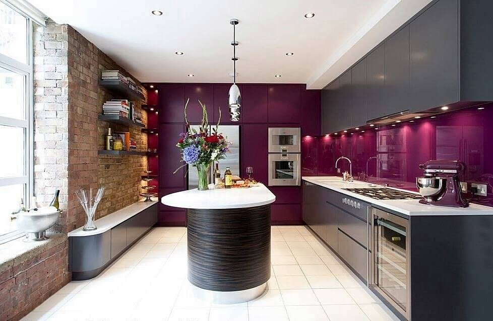 Черничный или фиалковый тон, который сочетается с черными блестящими глянцевыми или матовыми поверхностями, прекрасно дополнит интерьер просторной кухни с качественным освещением.