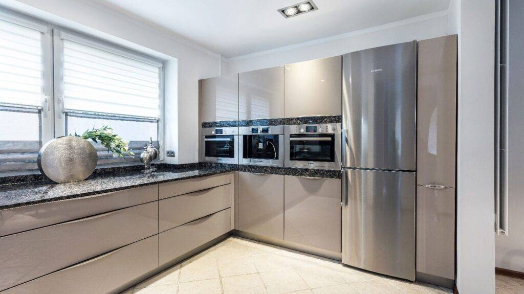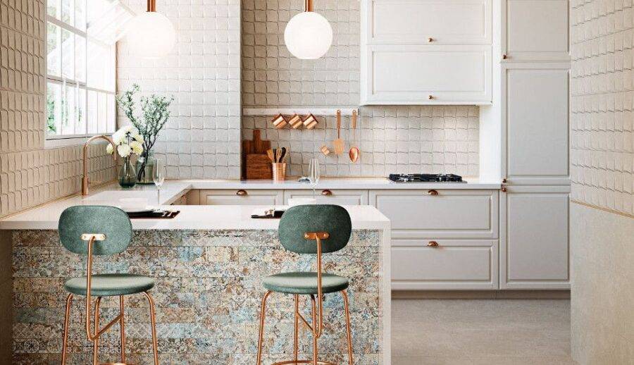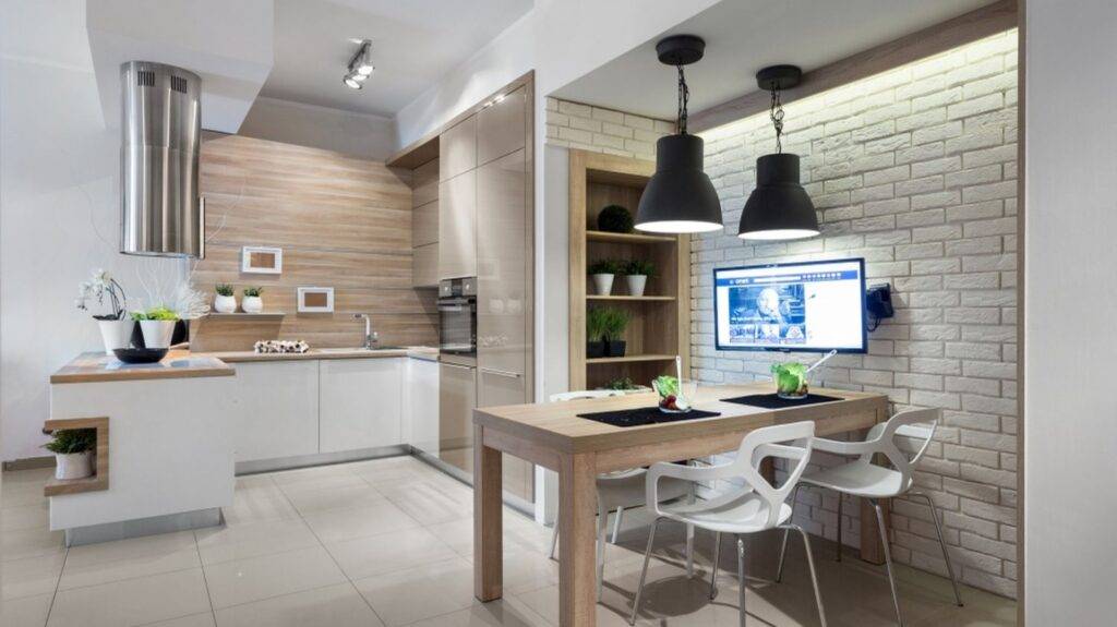 - Использование современных оригинальных элементов оформления, таких как 3D плитка, светильники необычной формы или металлические витрины с красивой посудой.