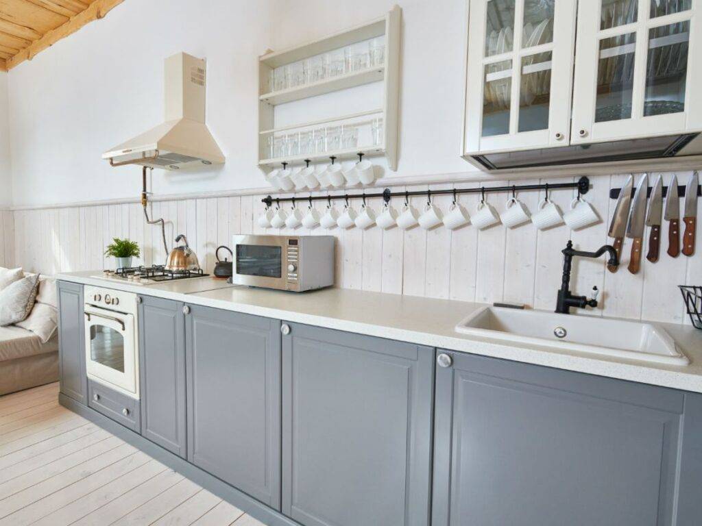 Кухня как помещение, где нужно протирать стены, нуждается в водоэмульсионной покраске акриловыми или латексными красками. Для кухонного интерьера подойдут нейтральные цвета, контрастные или в тон гарнитуру.