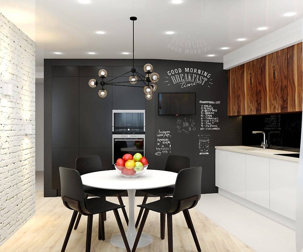 За деревянным столом будут одинаковые стулья, окрашенные в разные цвета: коричневый, черный и серый. Белые лампы, белые горшки и белая посуда, выставленные за черным стеклянным шкафом, завершат все.