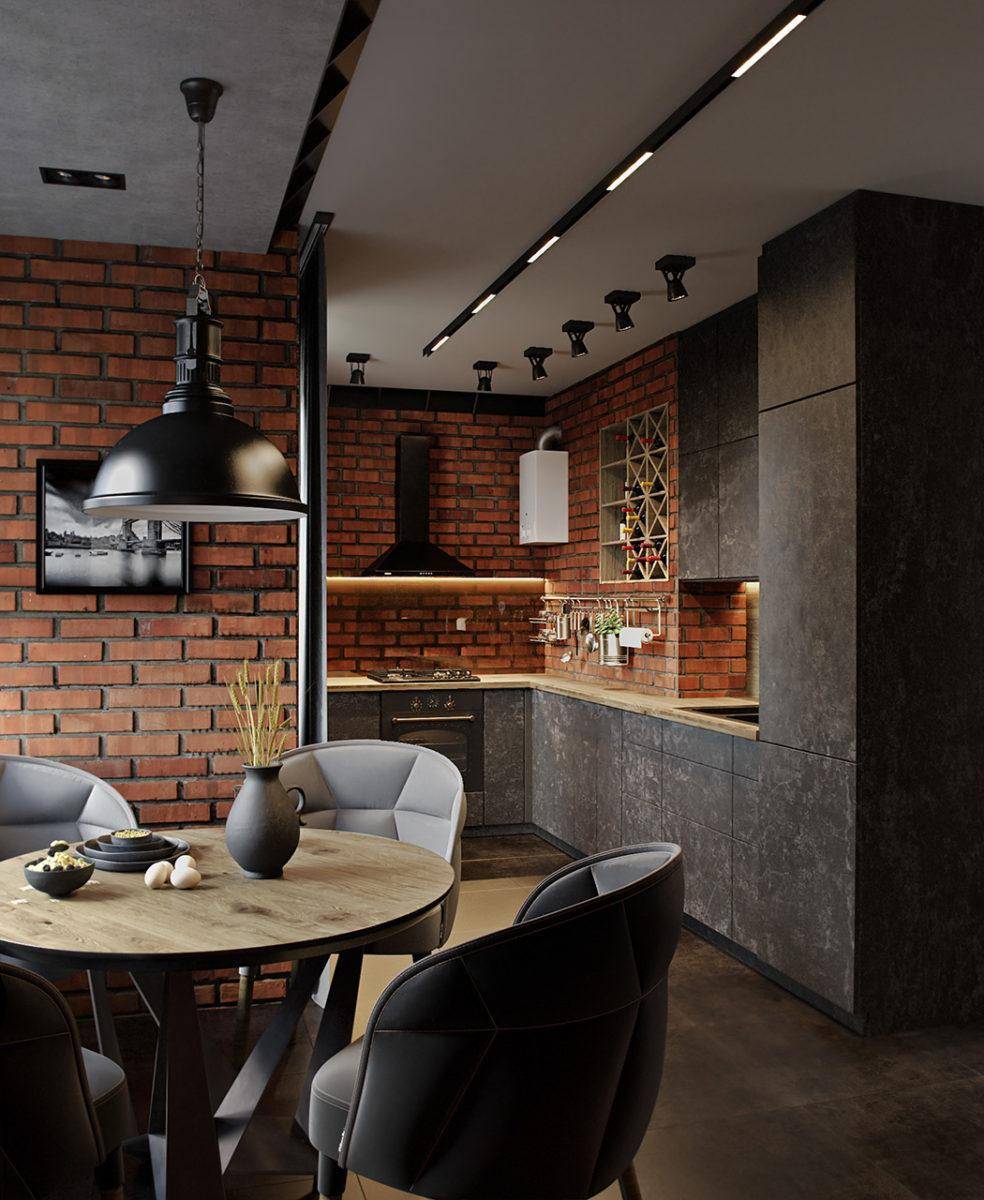 Кухня в стиле лофт может не иметь чёткого разграничения на обеденную и рабочую зоны (в тесном помещении стоит рассмотреть такой вариант, если он не будет дискомфортным для хозяев).