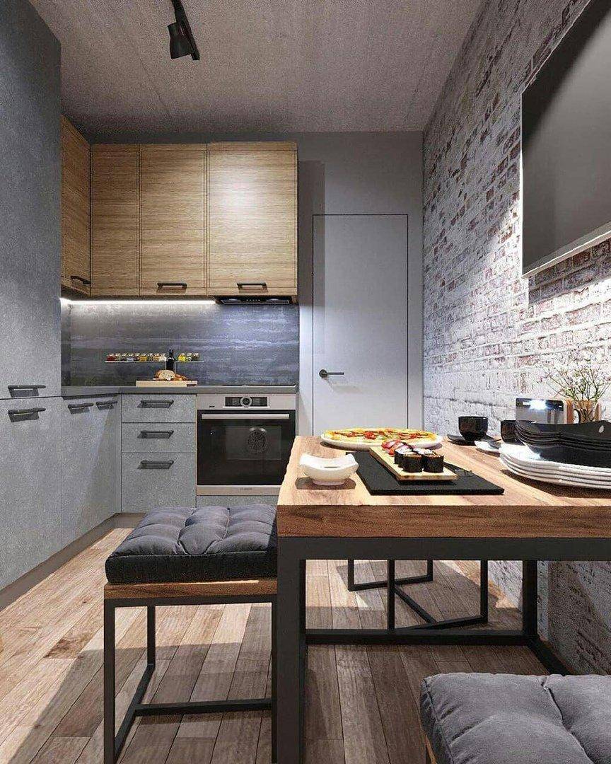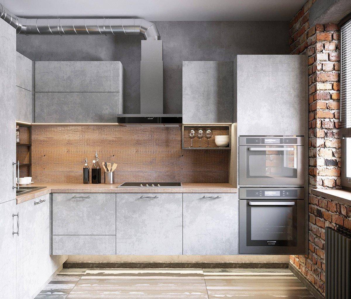 Грубый бетон или камень прекрасно смотрится с теплой древесиной и уютным кухонным текстилем. Чтобы оживить интерьер, можно добавить 1-2 живых цветка в минималистичных кашпо, а также сделать акцентный фартук: выложить необычной плиткой или продолжить материал столешницы.  Дизайн подчиняется функции, а не наоборот. Вся мебель и техника должны быть многофункциональными и расставленными по принципам эргономики.