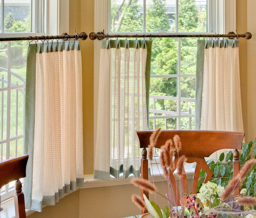Не переживайте, если из-за подгибки ткани высота шторки сильно уменьшится. Дизайн шторок кафе позволяет разного рода вольности, например, кружево или волан, который можно подшить в нижней части, чтобы скрыть недобор.