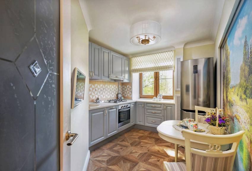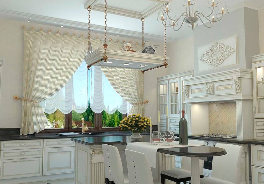 - Множество складок, украшений. Роскошность — главная задача в оформлении кухни ;
