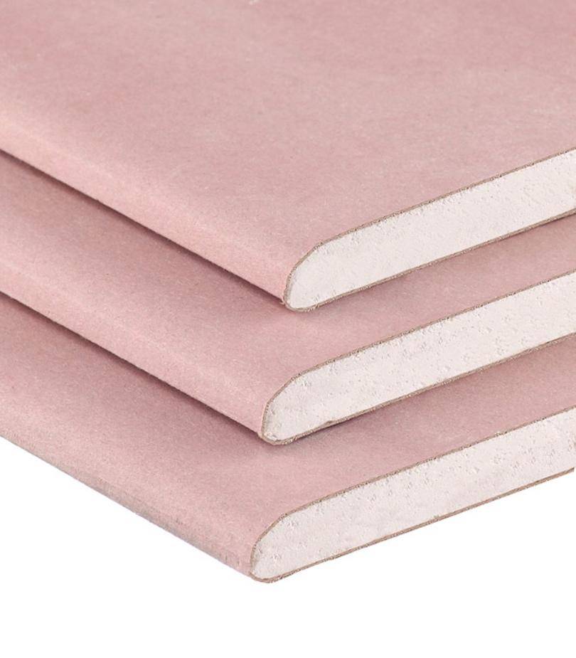 - «огнестойкий» – отличается от стандартного ГКЛ наличием пропитки из антипиренов (преимущественно негорючих солей металлов). Такой материал несколько тяжелее обычного (до 850 кг/м3) и имеет окрашенную в красно-коричневый цвет поверхность. Огнестойким гипсокартоном можно отделывать места интенсивного нагрева, расположенные около дымоходов, печей, каминов, в кухнях и пр.;