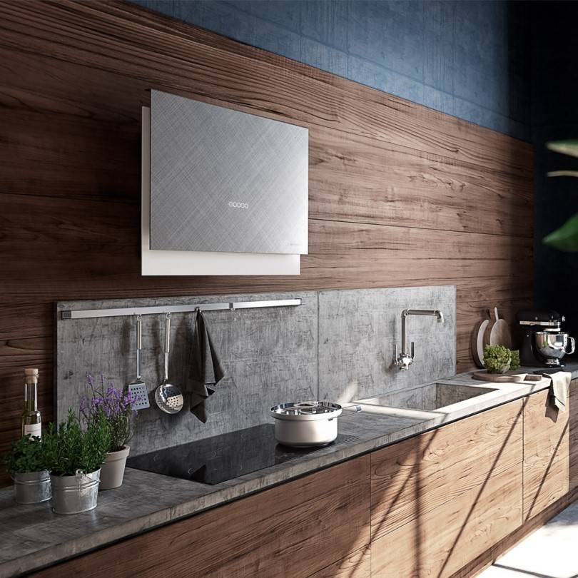 Это настенные устройства, как правило, компактные и с наиболее интересным дизайном. Высота наклонной вытяжки от варочной панели зависит от нескольких параметров – размера помещения и типа варочной поверхности. Рост человека здесь не играет большой роли, так как риск удара головой о корпус минимален. Поэтому эти устройства лучше всего подходят для высоких людей.