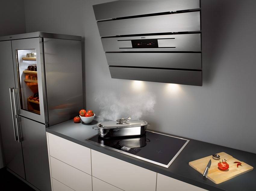 Перед тем, как приступить к расчету расстояния до вытяжки, стоит выбрать тип воздухозаборника. Они могут быть параллельными варочной панели (горизонтальными) или наклонными (наклонными). Каковы различия в их работе? Горизонтально под углом 90 градусов, и весь пар, запах, небольшие брызги смазки всасываются намного легче. Вертикаль выглядит привлекательно, но иногда для повышения производительности необходимо включать больше мощности. Однако использование этого типа оборудования намного комфортнее – вы можете избежать ударов головой о тело.