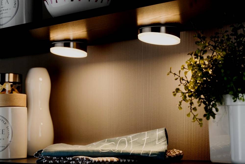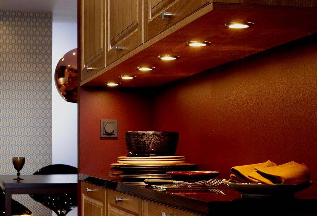 Существуют мебельные светильники — светодиодные, люминесцентные и галогенные лампы. Такие светильники предназначены для установки на навесных кухонных шкафах. Эти светильники очень хорошо освещают вашу рабочую зону, и с таким светом вам будет очень уютно и удобно готовить или заниматься своими делами.