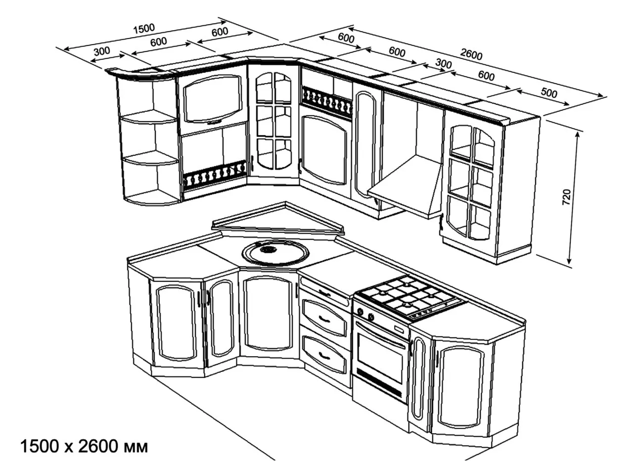 Ширина, высота и глубина модулей подбирается в соответствии с ростом хозяев, дизайнерским проектом и рядом других факторов. Не существует строгих ГОСТов, по которым производится угловая кухонная мебель. Но некоторые, принятые производителями размерные рамки, выделить можно: