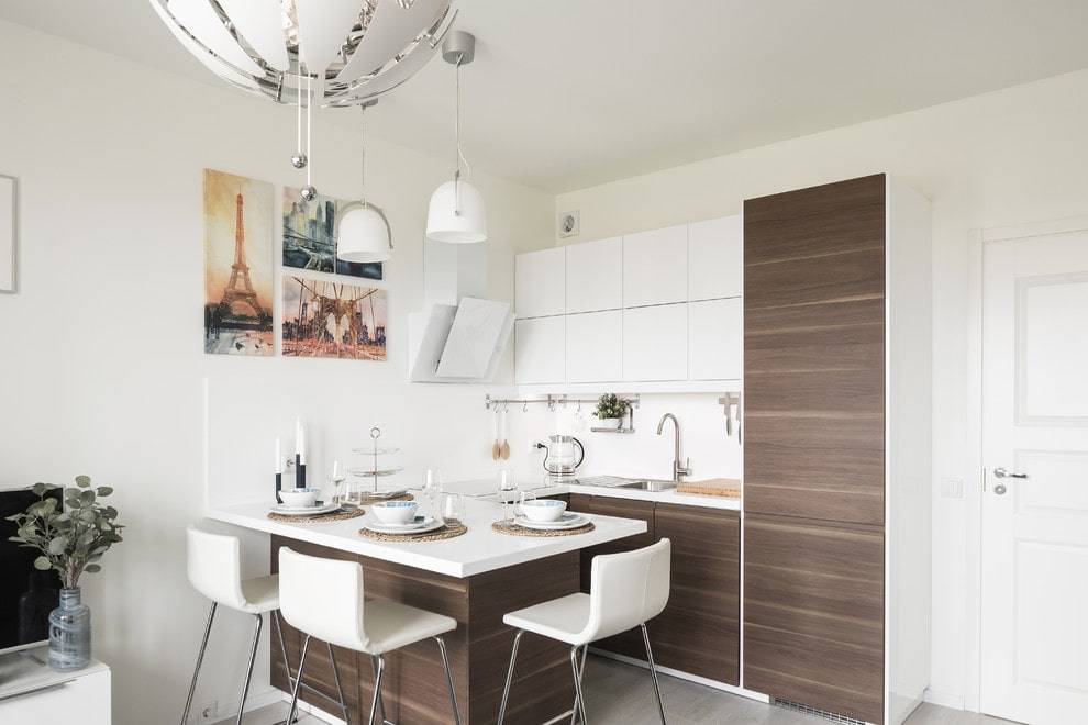 Барная стойка — настоящий тренд в современных стилях 2020. Она отлично подходит для молодежных интерьеров, за ней удобно работать, поскольку не приходится нагибаться. Вертящиеся стулья, которые к ней обычно прилагаются, понравятся детям. Разместить её можно параллельно гарнитуру, напротив него или у окна.