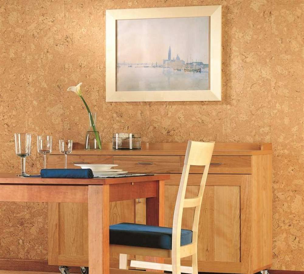 Пробковые обои являются натуральным материалом, поэтому стоят довольно дорого. Они легко очищаются водой и слабыми растворами моющих средств, изолируют помещение от посторонних звуков, улучшают микроклимат, имеют солидный вид.