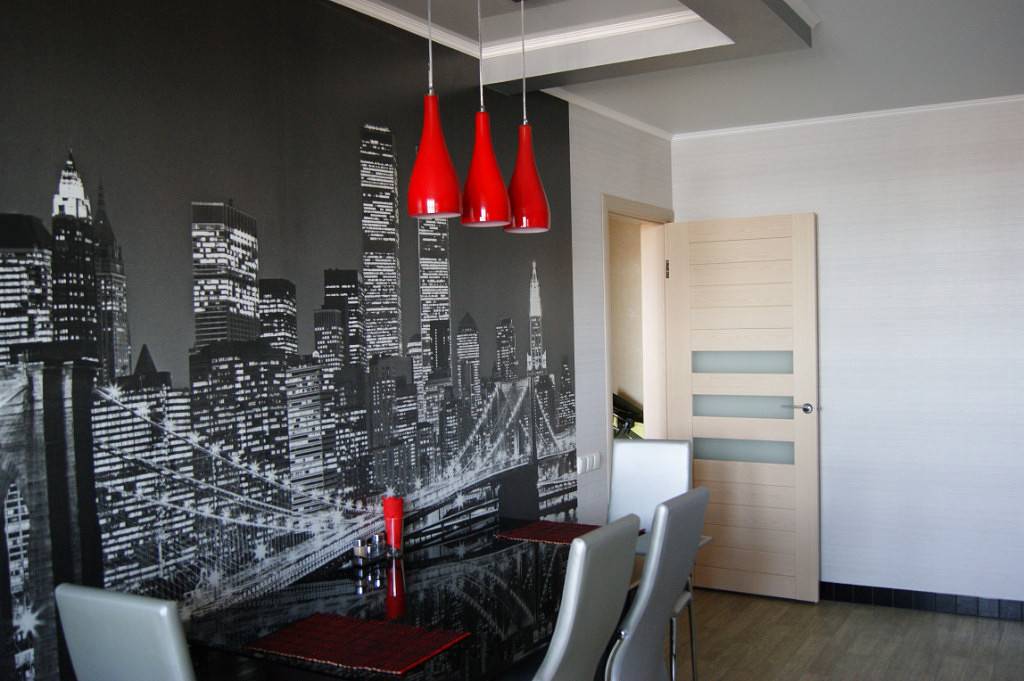 Не нужно клеить их сразу на все поверхности стен. Сделайте маленькой красочный акцент — так вы добьетесь неповторимого внешнего вида и избежите эффекта перегруженности. Наиболее целесообразно разместить подобные обои над кухонным столом или напротив него.