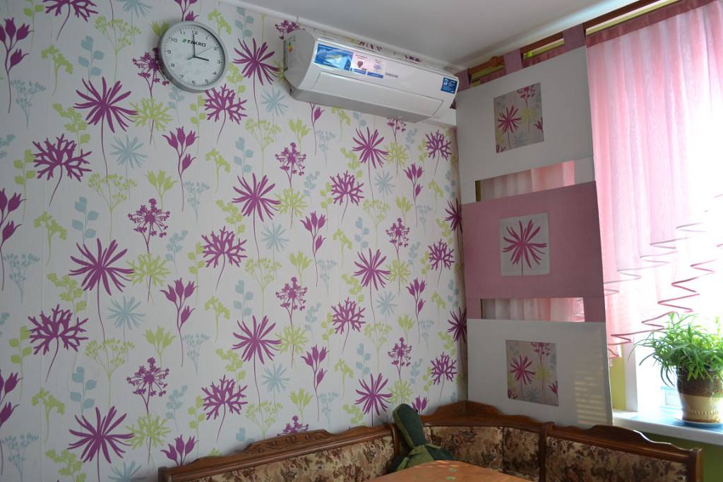 - Зонирование пространства. Использование разных оттенков обоев помогает, например, отделить зону для приготовления пищи и столовую.
