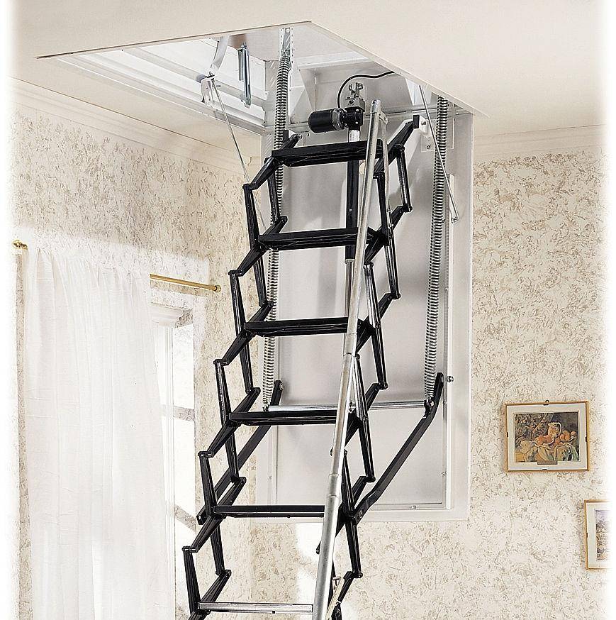 3. Если на чердак часто требуется подниматься хозяйки дома, а возможности установить стационарную лестницы нет, то можно также предложить монтаж складной лестницы. Однако, в этом случае рекомендуется выбрать не ручной режим трансформации, а автоматический. То есть по нажатию кнопки на пульте происходит открывания люка и выдвигается лестница. Справиться с такой системой сможет даже хрупкая женщина или подросток, не прикладывая особых усилий.