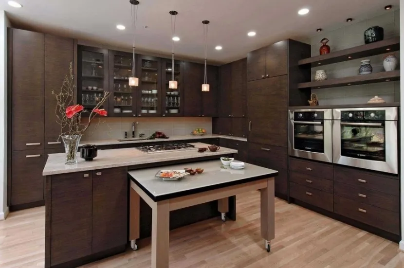 Имеет значение дизайн. Если кухонный островок обустраивается в квартире студийной планировки, идеальным вариантом гарнитура с выдвижным столом станет модель с выдвигающейся барной стойкой, оснащенная надежной опорой.