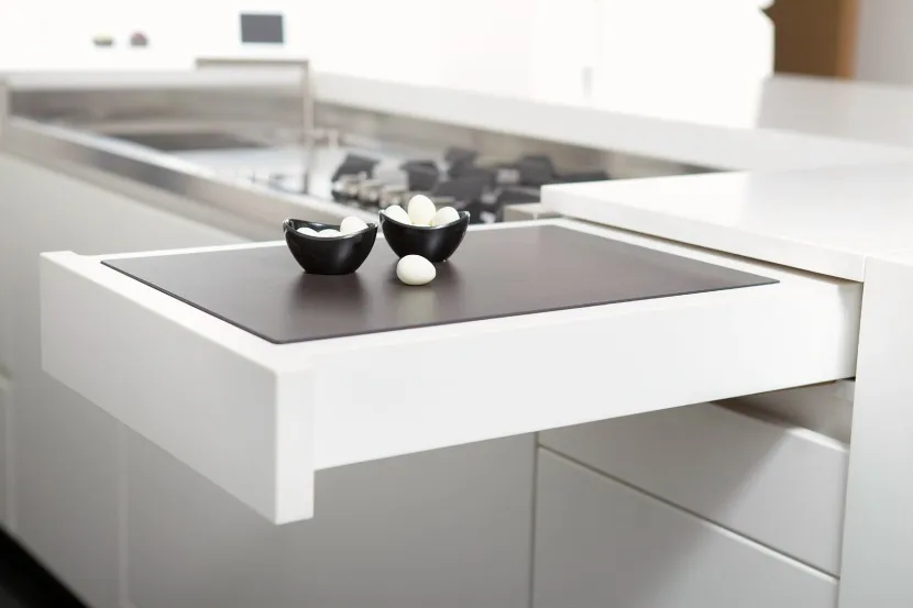 Под основной столешницей кухонного гарнитура устанавливается дополнительная деталь. Движению способствуют направляющие. Фурнитура монтируется на боковые стенки тумбы и торцевые части выдвижной поверхности. Плавность и бесшумность хода обеспечат доводчики.