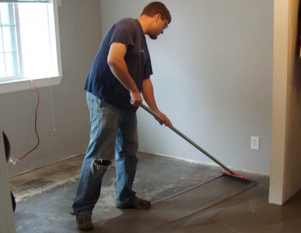 - Сначала тоже необходимо подготовить бетонный пол (убрать с него мусор и заделать на нем все дефекты раствором).