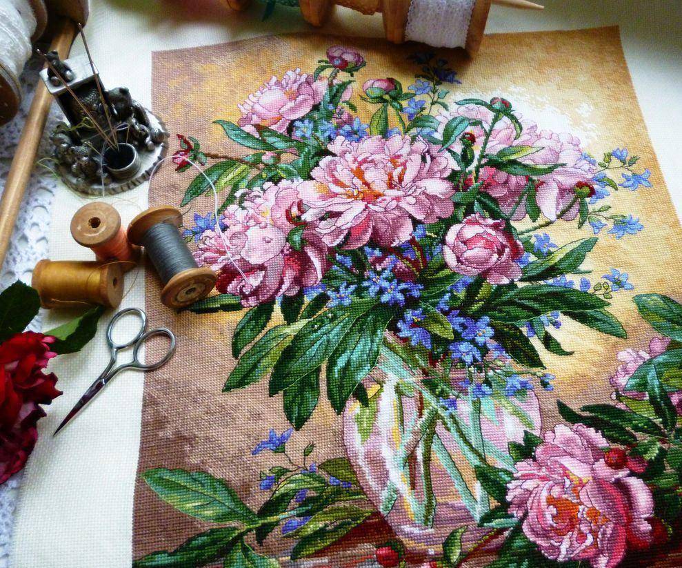 Любители вышивок крестиком часто обращаются к теме цветов. Если бы проводился чемпионат мира среди наборов для вышивки композиции «Пионы в вазе», первое место можно было бы дать набору от компании «Риолис». Их картины разрабатывает собственный отдел художников, эксклюзивно для этой компании. Палитра оттенков подобрана очень тщательно. Художник Анна Петросян продумала композицию так: букет пионов стоит в вазе, которая прорисована не полностью, как будто использовались акварельные краски.