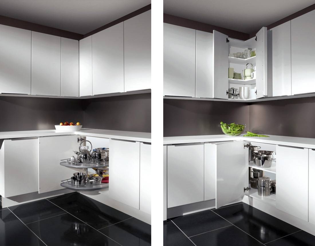 Угловые модули можно функционально использовать при помощи выкатных, выдвижных или вращающихся конструкций хранения