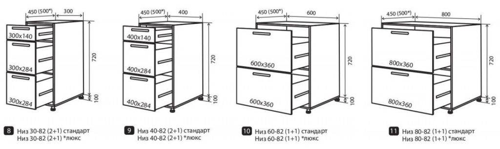 Размер выдвижных ящиков зависит от используемой фурнитуры и в большинстве случаев не должен быть меньше 120 мм по высоте. Существуют сравнительно дорогие механизмы для 100-миллиметровых цоколей, но, помимо дороговизны, они не так долговечны, как детали стандартных размеров.