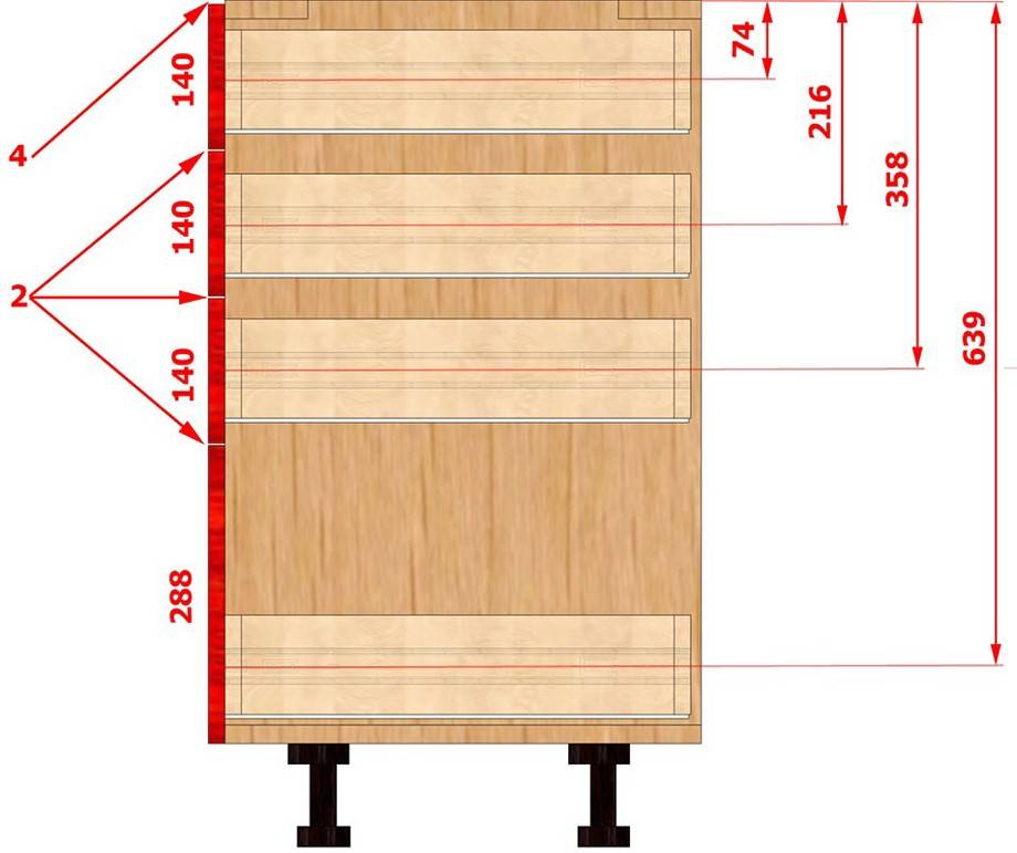 Размер выдвижных ящиков зависит от используемой фурнитуры и в большинстве случаев не должен быть меньше 120 мм по высоте. Существуют сравнительно дорогие механизмы для 100-миллиметровых цоколей, но, помимо дороговизны, они не так долговечны, как детали стандартных размеров.