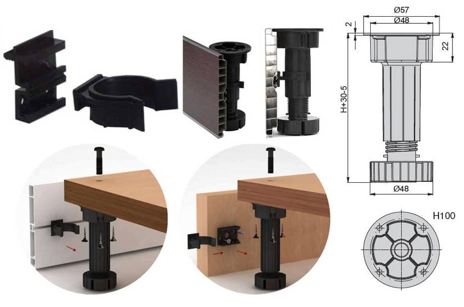 Стандартные ножки, которыми комплектуется большинство кухонь, изготовлены из прочного полимера, имеют величину от 100 до 200 мм. Регулировка осуществляется пластиковой гайкой, ход которой позволяет компенсировать до 4 см неровностей. Сейчас доступны регулируемые изделия из хромированного металла или пластика.