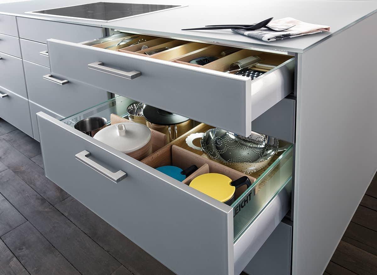 Увеличить полезное пространство нижних тумбочек возможно, если разместить в их нижней части дополнительные выдвижные ящики. Они легко монтируются как в моделях на ножках, так и в гарнитурах без них. Основное требование — достаточная для установки высота цоколя.