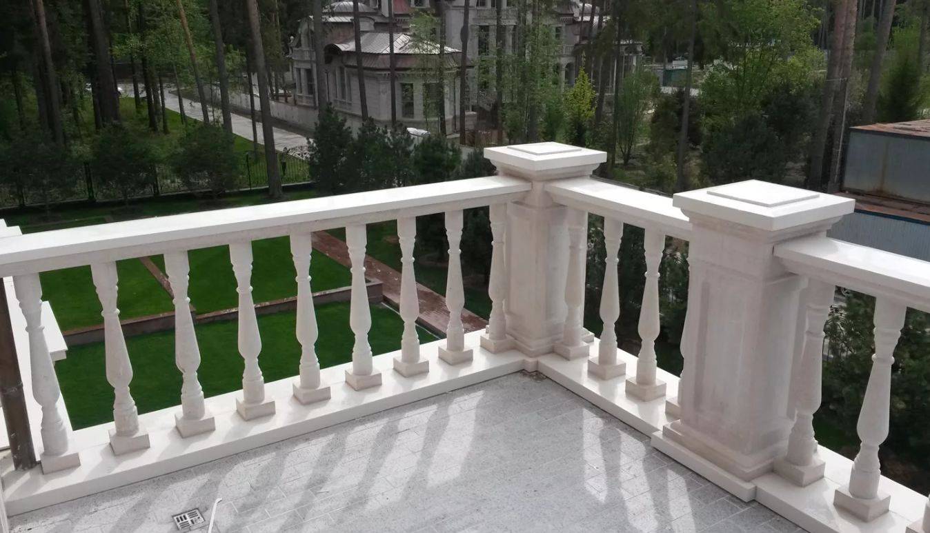 Перед началом работы очищают край плиты, устраняют выбоины. Затем производят замеры площадки, вычисляя количество балясин (длину пролета делят на зазор между центрами деталей). На площадке размечают места крепления опор (в углах и по длине сторон, если это нужно — на расстоянии 1 м друг от друга). При помощи водяного уровня отмечают точки прикрепления горизонтальных элементов к стене здания.