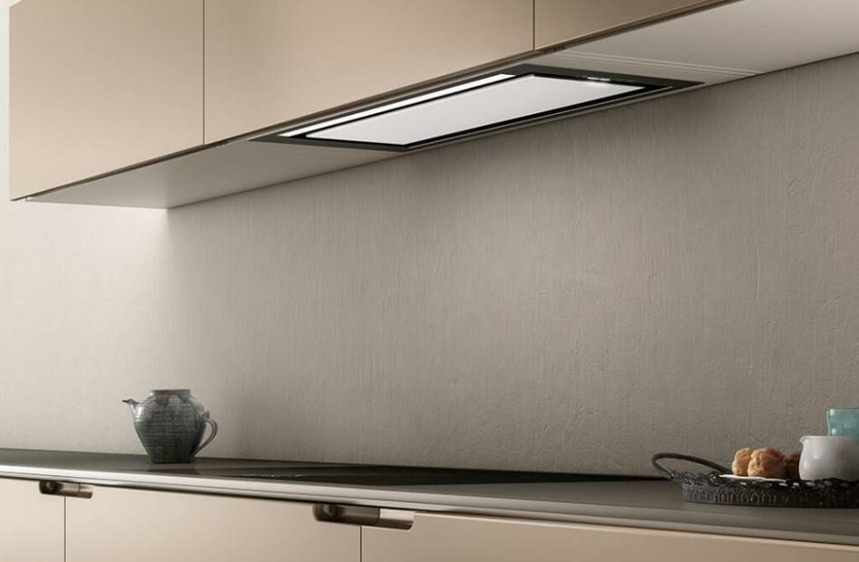 - встраиваемые — самые компактные, мощные и менее заметные. Монтируются непосредственно в навесной шкаф или декоративный каминный купол, либо в рабочий стол рядом с варочной поверхностью. Оснащаются стационарной или выдвижной нижней панелью. Первая – существенно увеличивает площадь забора воздуха и облегчает управление;