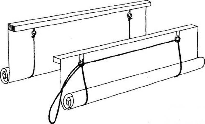 Далее нужно прикрепить получившуюся конструкцию к оконной раме или над ней. Отрезать тесьму, равную длине заготовки для шторы плюс 5−10 сантиметров на завязки. Перекидывают шнурок через карниз, выравнивают концы. Если используется одинарный шнурок, то его необходимо прикрепить к верхней планке.