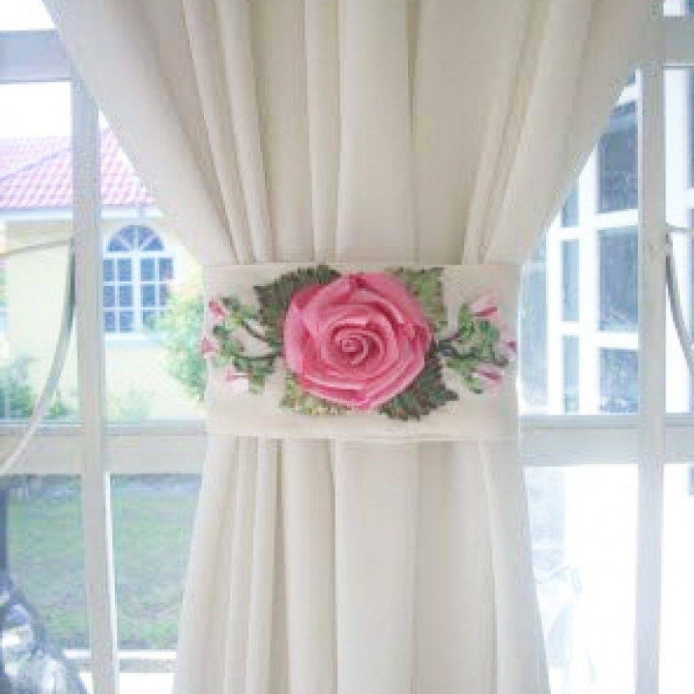 Шикарные вещицы, можно сделать скомбинировав техники, создания цветов из атласных лент, бусин и страз и кружева. Романтический образ с некоторой нотой винтажности привнесут в интерьер такие украшения для занавесей.
